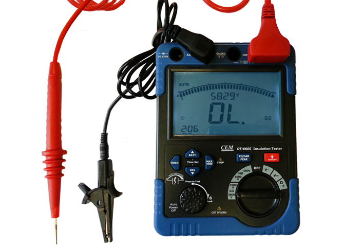 DT-6605 to profesjonalny miernik rezystancji izolacji z dużym wyświetlaczem i bargrafem. Miernik przeznaczony do  pomiaru rezystancji do 60GΩ, z regulowanym napięciem probierczym do 5 kV.