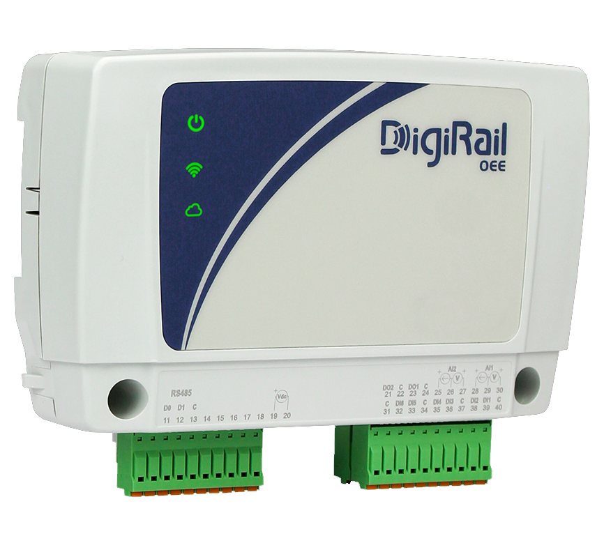 DigiRail OEE to moduł IoT dedykowany do aplikacji OEE i systemów przemysłowych MES.
