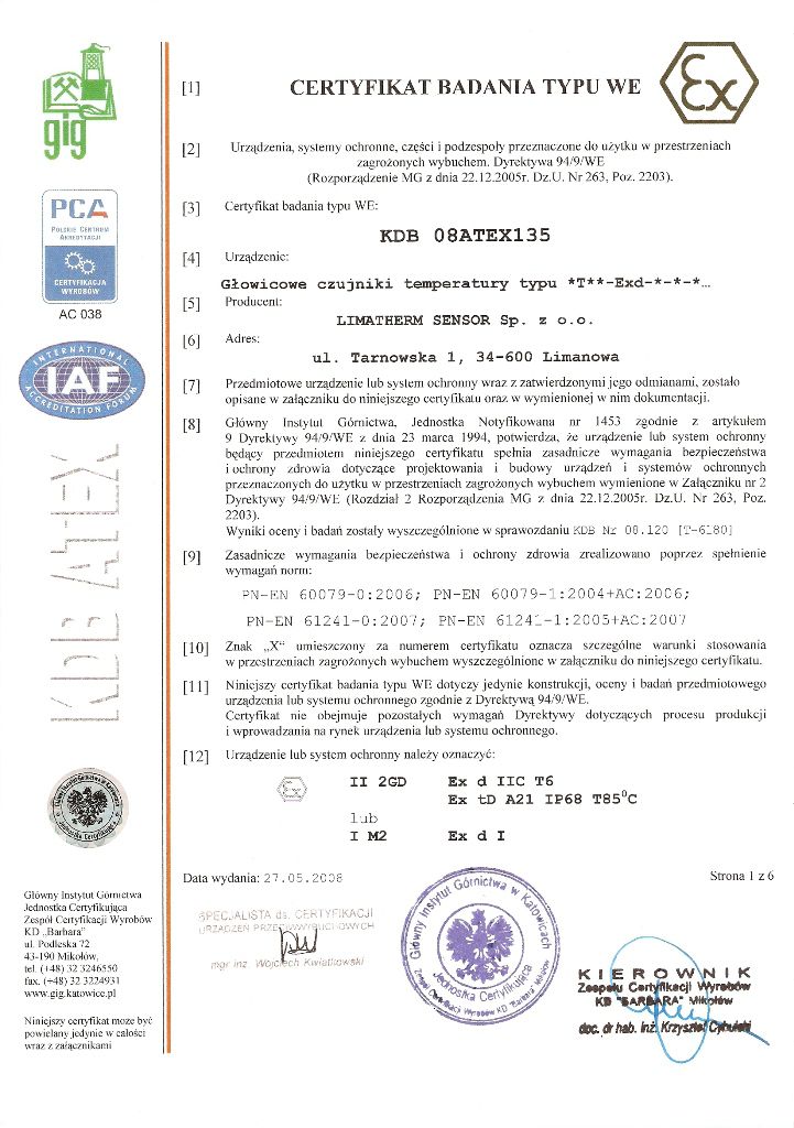Czujnik przeznaczony jest do pomiaru temperatury mediów ciekłych i gazowych. Czujnik posiada dopuszczenie do stosowania w strefie zagrożonej wybuchem: I M2 Ex d I Mb (z głowicą NS) II 2G Ex d IIC T6 Gb II 2D Ex t IIIC T85ºC Db IP66